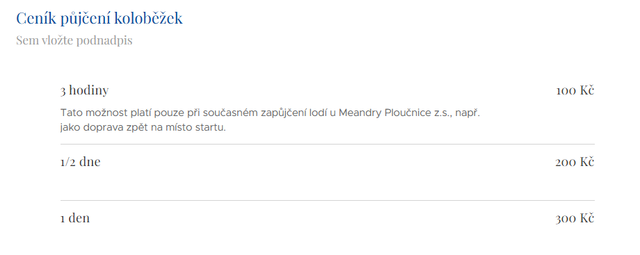 Zapůjčení koloběžek je možné na Tábořišti Meandry na Borečku nebo na Brenné na výstupní místě Meandry. K dispozici jsou dvě velikosti koloběžek - větší (pro pány) a menší (pro dámy a děti).